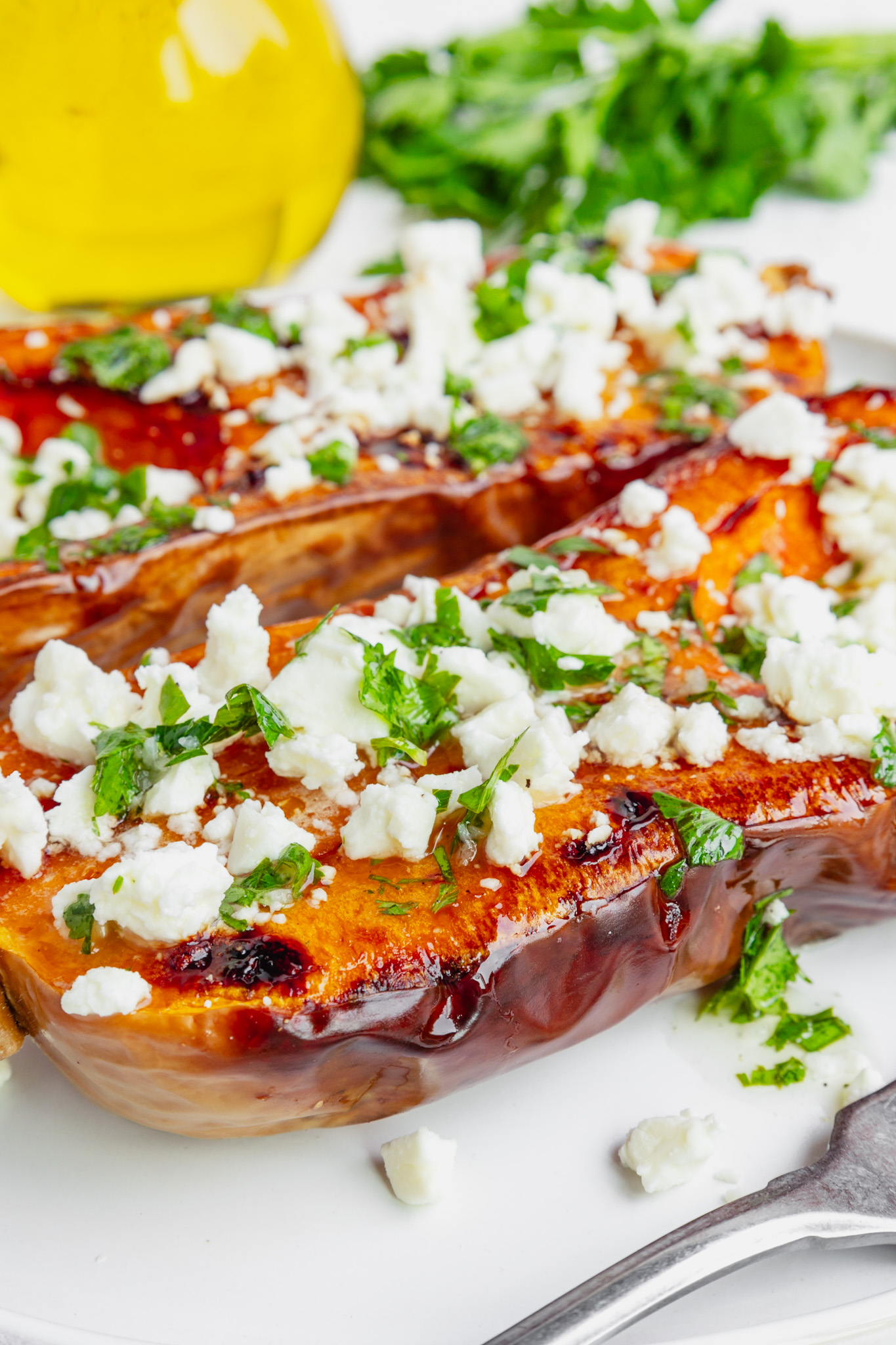 This easy baked butternut squash, topped with feta and drizzled with a fresh lemon-herb dressing is honestly one of my favourite things to eat through the autumn. Think warm autumnal salad.