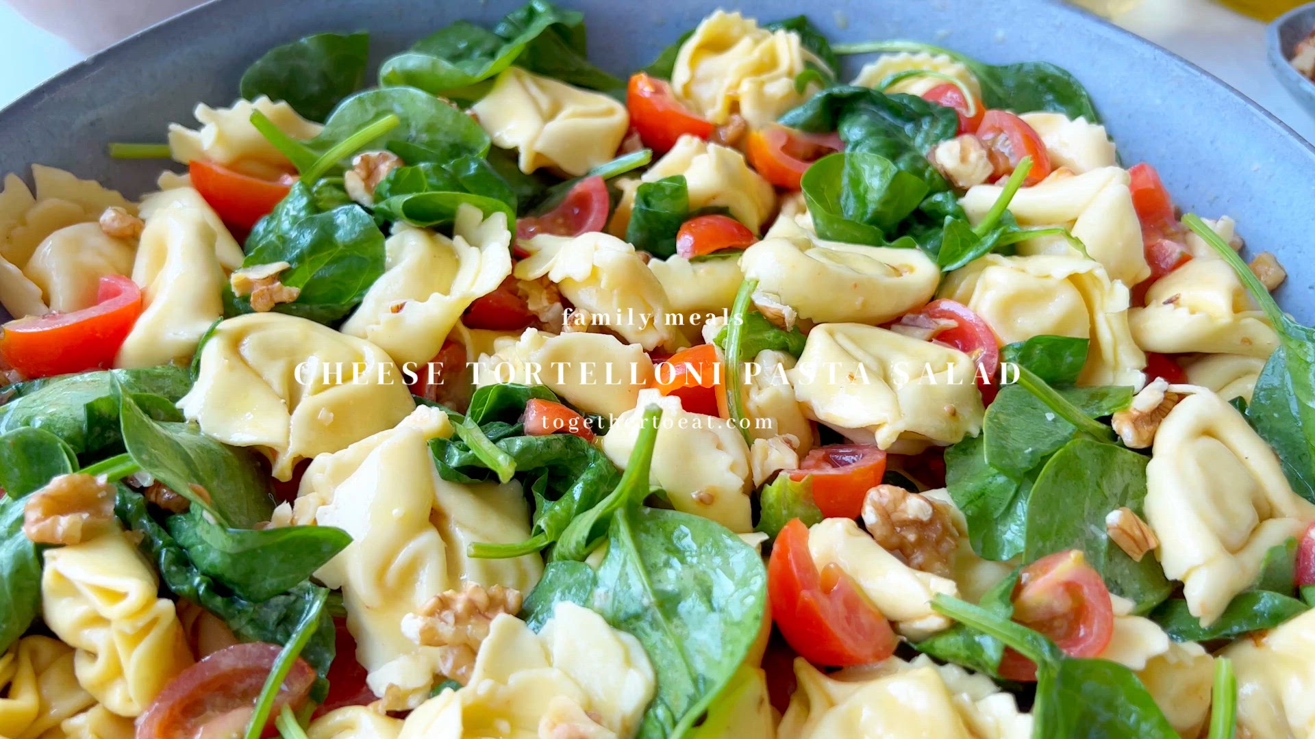 This delicious summer salad made with four cheese tortelloni pasta, cherry tomatoes, spinach and walnut pieces, all tossed in a homemade mayo vinaigrette is hearty and quick to make.