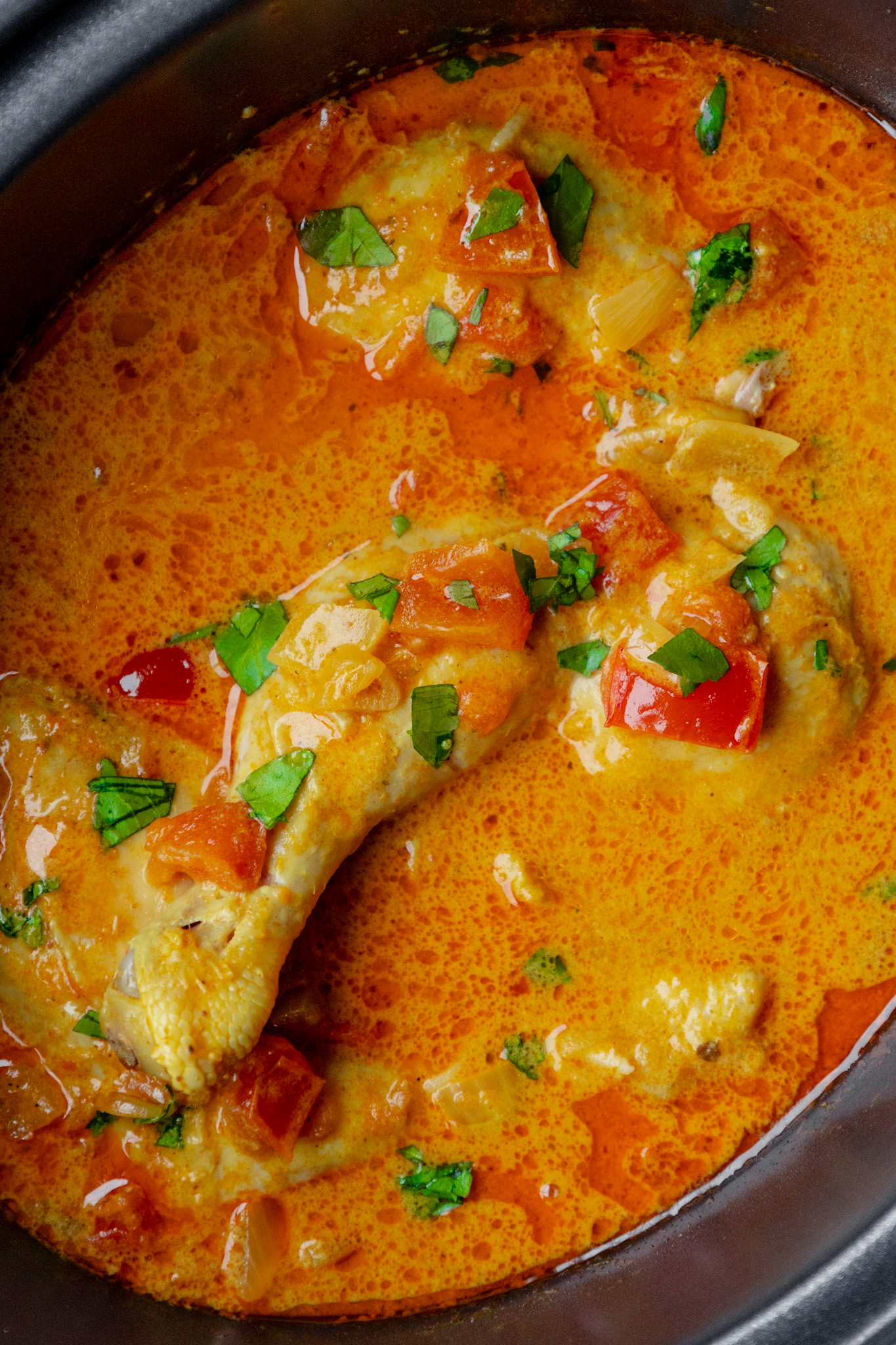 - Add in the coconut milk, stirring until well combined. Turn heat to high and add in the chicken legs top side down (see note 2 if you want to brown the legs first). Bring to the boil, cover and turn heat to low. Cook for 20 minutes, uncover and give it all a good stir and turn the chicken legs over. Cook for a further 40 minutes uncovered, stirring occasionally so the sauce doesn't stick to the bottom of the pan and burn.