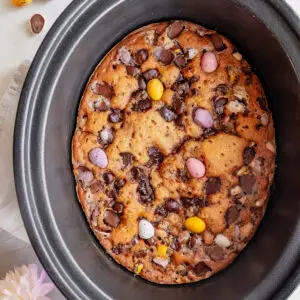 This Mini Egg Slow Cooker Pudding is essentially a vanilla sponge with Mini Eggs baked in. Some of the Mini Eggs go all melty and others stay pretty much in their usual form, so you can still tell what they are. I use light brown sugar instead of white for caramelised notes, plus this pudding just happens to be egg-free and only uses a handful of ingredients. And did I mention it can be prepped in just 5 minutes?!