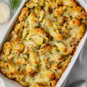 This festively delicious layered Sausage Stuffing Potato Bake can be served as a main meal or as a side dish to roast chicken or turkey. You can make it with Brussels Sprouts (seen here) or if your fam is not a fan, with broccoli. And it's not just for Christmas, it's just the kind of comfort food we want to be eating all autumn and winter long!